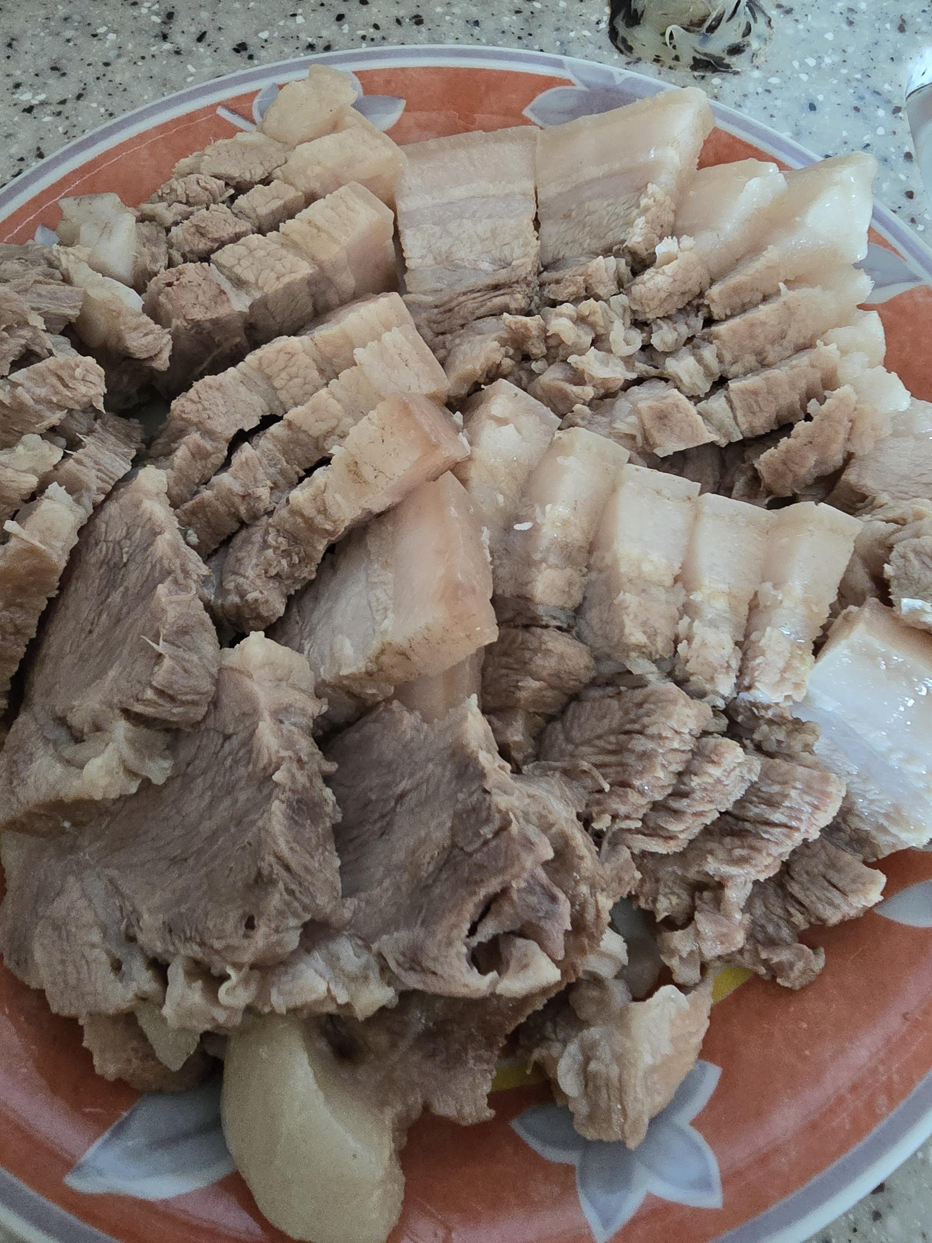 대부분 된장 혹은 커피(아니면 둘다), 생강과 마늘, 월계수잎은 당연하고. 소주를 넣거나 양파즙 대파뿌리 등등을 넣을 때도 있고 그때그때 다르지만 이번에는 그냥 심플하게 삶았습니다. 갑자기 한방수육을 해볼까 하고 쌍화탕 반병을 넣었을 뿐, 생강, 마늘, 월계수 잎. 그리고 굵은 소금 두스푼 넣고 대파 조금 넣고 삶아냈답니다.