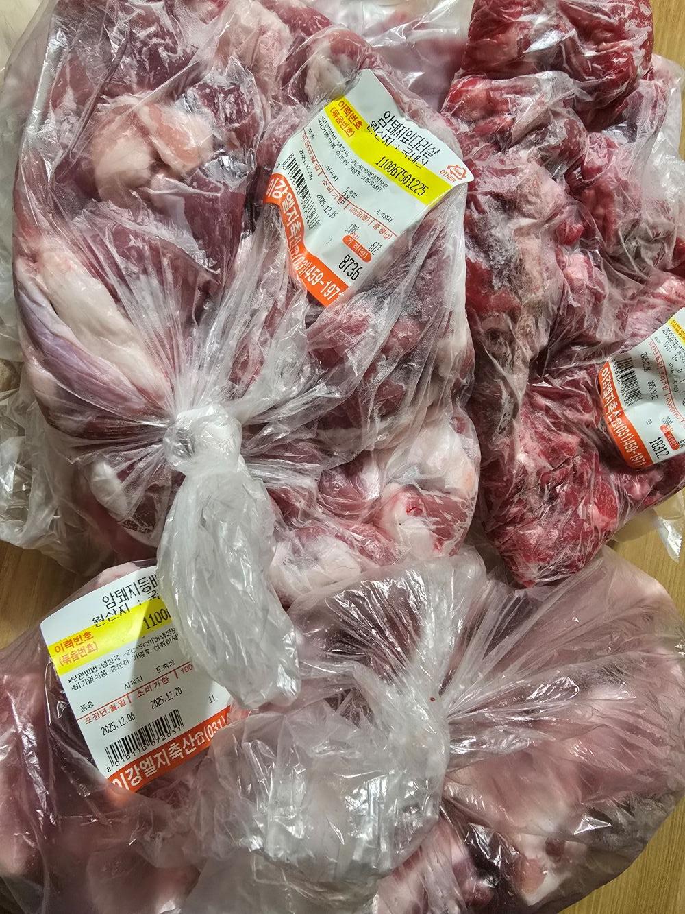 고기 사러 갔던 날 등뼈 2kg도 함께 사 와, 당일 세 시간에 걸쳐 찬물에 담궈 피를 빼고, 끓는 물에 강황가루와 마늘, 후추 등등을 넣고 데친 뒤 냉동실에 절반씩 소분해 얼려두었습니다.