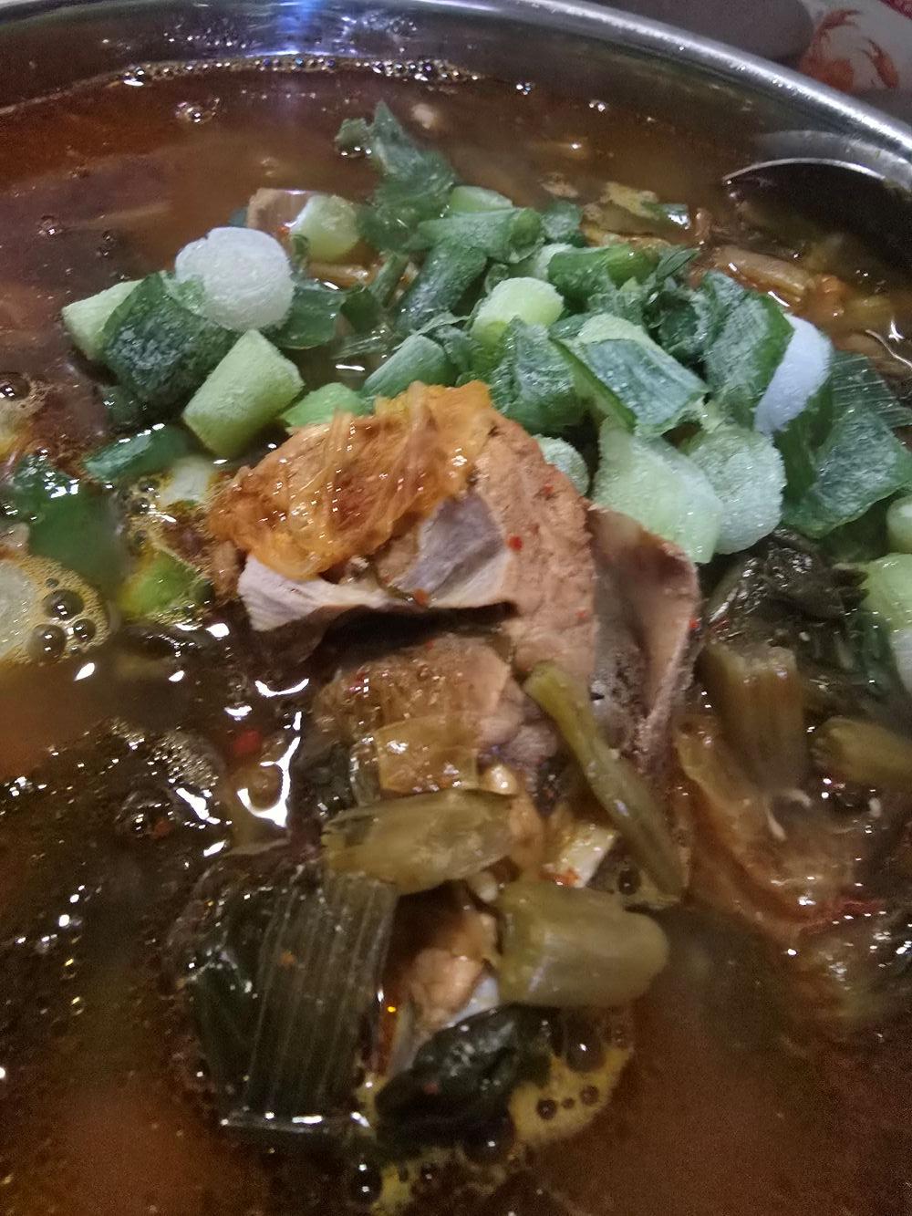 압력솥이 딸랑거리기 시작한 뒤, 불을 중간불로 낮추고 5분에서 10분 정도 끓여주면 완성입니다. 먹기 좋도록 일반 냄비로 옮기고, 냉동실의 얼린파를 살짝 얹어주었어요.
