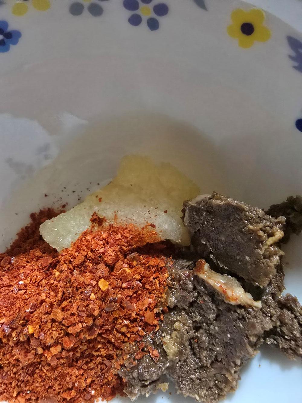 • 다시 냄비에 뼈를 넣고 고추장, 된장, 고춧가루, 국간장, 다진 마늘로 양념합니다.